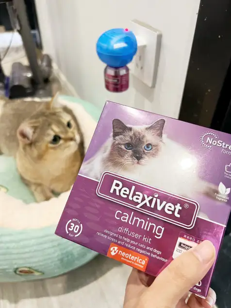 含有信息素的喷雾、项圈和插件也有助于减轻压力。Relaxivet瑞乐事 模仿了猫咪用来标记领地的信息素,让它们感觉更安全。