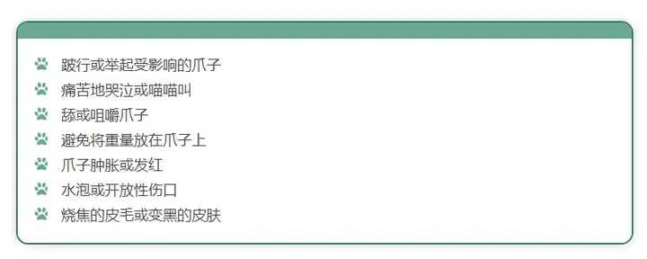 像许多动物一样,猫非常善于隐藏自己的痛苦。但有一些迹象表明,你的猫正因脚掌烧伤而疼痛,包括: