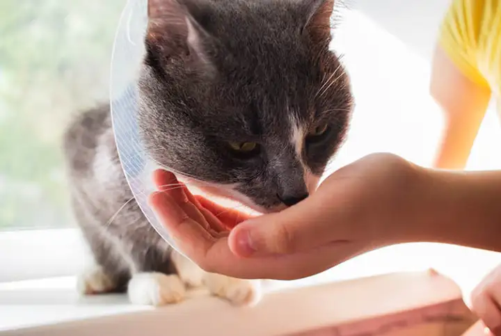 如果你的猫在戴着蛋筒的时候完全拒绝进食,问问你的兽医是否可以在严格的监督下在进餐时间暂时脱掉蛋筒。几天不吃东西或吃得不够的猫会发展成一种威胁生命的疾病,称为肝脏脂质沉积症。如果所有其他选择都失败了,移除圆锥可能是你唯一的选择。没有兽医的允许,千万不要这样做,当你的猫吃东西的时候,要靠近它。只需要分神的一瞬间,它们就可以用锋利的牙齿撕开缝线。一旦你的猫咪吃完晚餐,就把蛋筒放回原处。